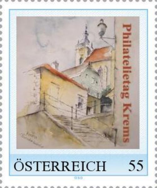 Die personalisierte Marke, nach einem Bild der Künstlerin Lotte Zellermayer zeigt das Frauenbergkirche in von Krems.